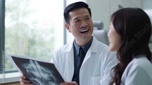 Asian Chinese male dentist explains x-ray to patient