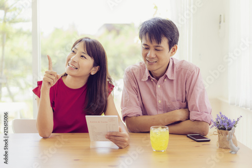 Asian couples order food to waiters in restaurant.