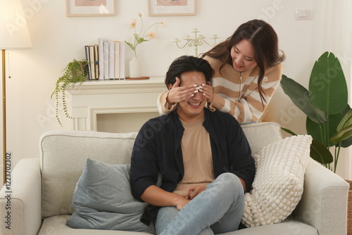 Asian family happy and warm love girlfriend standing on sofa blindfolded handsome husband sitting on sofa happy romantic together in living room at home
