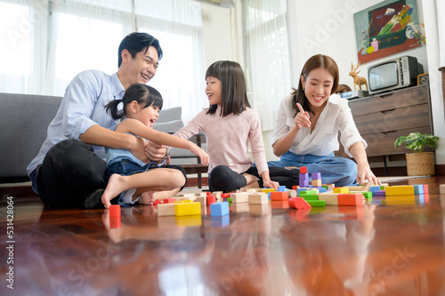 Asian family with children playing and building tower of colorful wooden toy blocks in living room at home, Educational game.