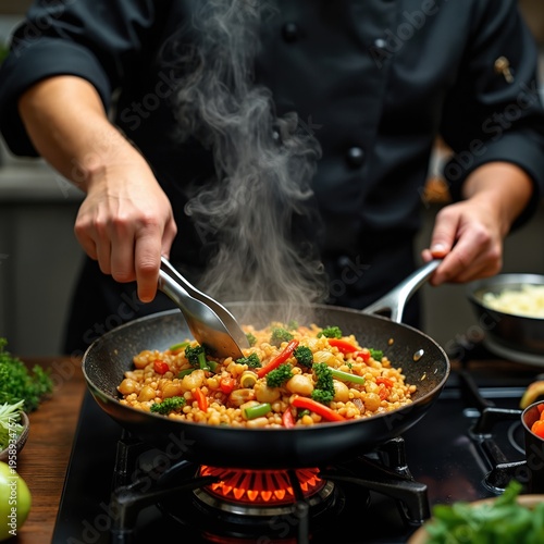 Asian male chef cooks vegetables in wok on gas stove. Steam rises from pan with broccoli peppers and pasta. Pro chef prepares food in restaurant kitchen.