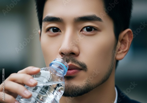 Asian man drinking from a bottle