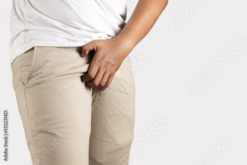Asian man in reaction of scratching crotch on white background, closeup. Annoying itch or Tinea Cruris. Human body problem or healthcare and medicine concept.