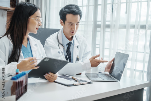 Asian medical doctors specialist in white lab coats working together, discussing at meeting about blood test results, anemia, infection in the bloodstream, diabetes