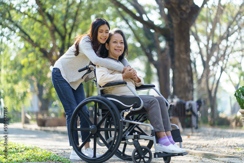 Asian senior woman in wheelchair with happy daughter. Family relationship retired woman sitting on wheelchair in the park age care at retirement home.