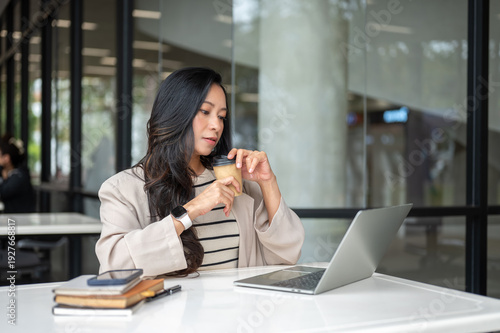 Asian woman holding coffee looking at laptop aside book and phone sitting at table in cafe building.