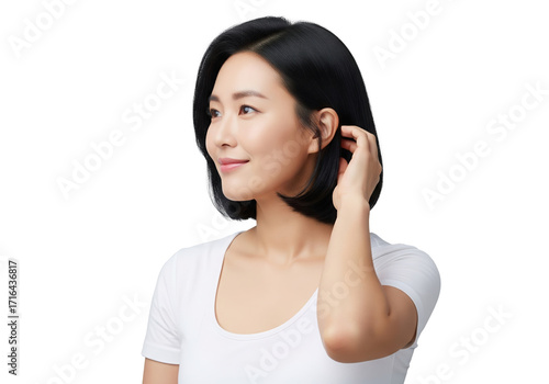 Asian woman in white tee, brushing hair back behind ear isolated for versatile product advertisement