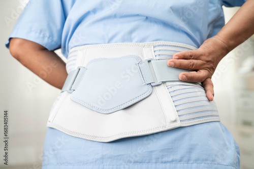 Asian woman patient wearing back pain support belt for orthopedic lumbar with walker.