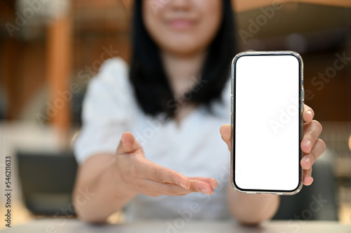 Asian woman showing a smartphone white screen mockup to camera. cropped image