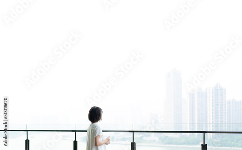 balcony, woman, relax, back, summer, urban, city, 1, leisure, chinese, lady, people, person, adult, asian, young, female, lifestyle, standing