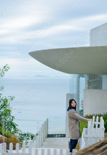 Asian woman traveling around The Water Drop Library at Thaili Cloud Hotel, Shuangyue Bay, Huidong, Huizhou, Guangdong Province, China