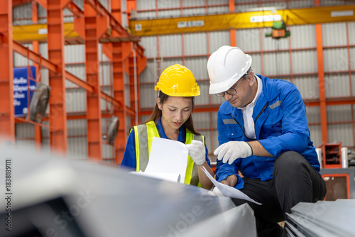 Asian woman worker with helmet and safety vest holds clipboard, discuss with supervisor at industrial site. Senior foreman gives instructions to staff while inspects machinery at manufacturing factory
