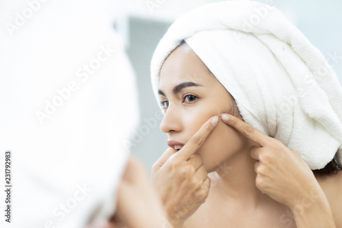 Asian women are squeezing acne after bathing.