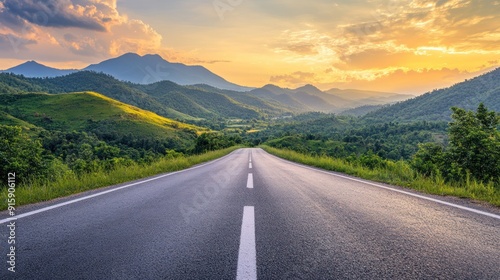 road, mountain, landscape, asphalt, sky, sunset, horizon, green, summer, nature, travel, journey, adventure, open, path, way, direction, tree, hill, countryside, rural, winding, curve, drive, trip, exploration, scenic, beautiful, view, cloud, sunshine, gold, light, bright, wide, highway, lane, line, distant, grass, field