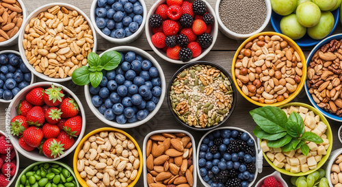 Assorted bowls of fresh fruits, nuts, and berries displayed in vibrant colors.