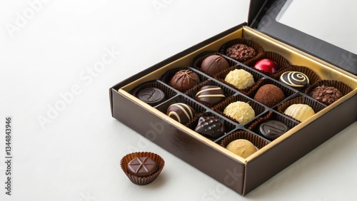 chocolate, box, assortment, candy, sweet, dessert, confectionery, treat, food, epicure, luxury, dark, milk, white, filling, sugared-almond, truffle, caramel, cocoa, delicious, tasty, brown, gold, square, isolated, background, studio, photo, image, product, commercial, object, cardboard box, texture, surface