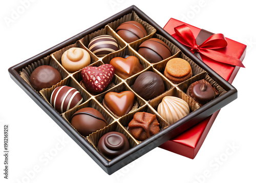 Assorted chocolates in open gift box with red ribbon