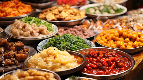 Assorted Colorful Asian Cuisine Dishes in Vibrant Market Display : Generative AI