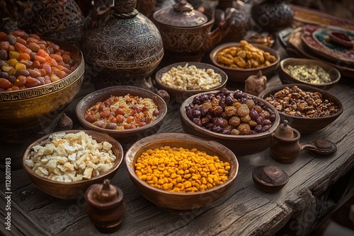 dried fruit, nut, spice, food, bowl, wooden, table, market, exotic, healthy, cookery, ingredient, organic, display, delicious, tasty, snack, variety, asian, turkish, ancient, traditional, oriental, rustic, brown, natural, colourful, epicure, texture, arrangement, composition, still life, trade, market stall, retail