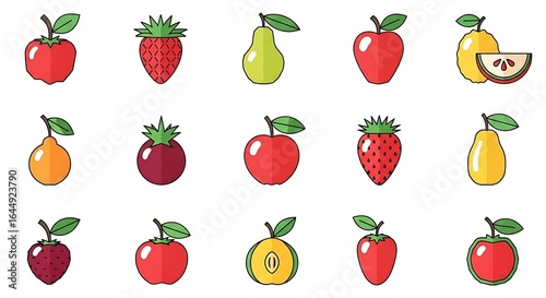 apple, pear, strawberry, plum, guava, fruit, vector, illustration, food, diet, organic, fresh, red, green, yellow, sweet, healthy, leaf, plant, design, graphic, clip art, isolated, background, drawing, ripe, vitamin, nature, group, slice, cut, half, collection