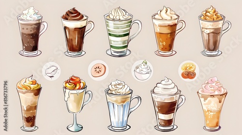Assorted Gourmet Espresso Drinks and Coffee Beverages Displayed in Glasses and Mugs