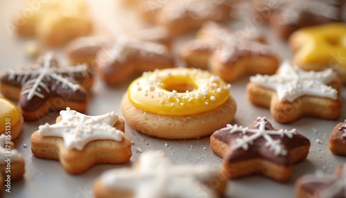 Assorted iced cookies feature festive winter holiday shapes like stars and rings. Delicious sweet treats perfect for Christmas, New Year, or any winter celebration.