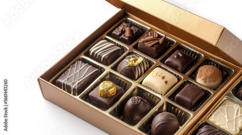 luxury, box, assorted, chocolate, open, lid, dark, milk, neatly, arranged, inside, gold, brown, cardboard box, isolated, white, background, product, photo, elegant, minimal, food, styling, confectionery, sweet, epicure, dessert, premium, decadent, indulgent, festive, gift, treat, chocolate, collection, refined, sophisticated, visually, appealing, tempting, handcraft, artisanal, fine, quality, delectable, mouth-watering, vibrant, rich
