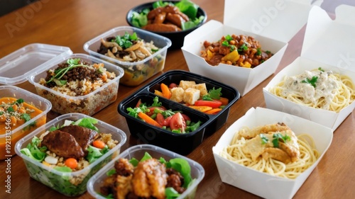 assorted, meal, container, cookery, food, diverse, dish, variety, healthy, lunch, dinner, take-out, epicure, selection, culinary, wooden, table, pasta, rice, vegetable, salad, chicken, beef, tofu, chili, garnish, colourful, alimentary, serving, freshness, protein, herb, sauce, delicious, balanced, homemade, cooking, diet, portion, container, savoury, spicey, appetising, contemporary, modern, preparation