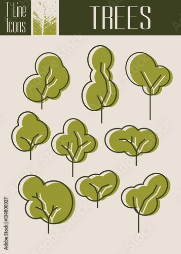 Assorted Outlined Tree Icon Set Isolated. Collection of Outline Icons For Web and Mobile. Summer and spring seasons. Green overlay spot