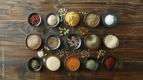 spice, herb, wooden, table, bowl, assortment, seasoning, food, cooking, culinary, ingredient, pepper, salt, background, rustic, wooden table, aromatic, cookery, epicure, food photography, design, print, organic, natural, healthy, plant, dry, green, favor, dried, topview, texture, culinary arts, table setting, colourful, fresh, arrangement