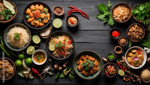 assorted thai food in flat lay composition On a black wooden background. Top view. Free space for your text.