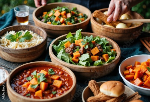 Assorted vegetable dishes and bread served in wooden bowls for a hearty meal