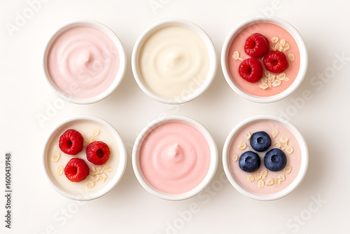 Assorted Yogurt Bowls with Fresh Berries and Oats on White Background