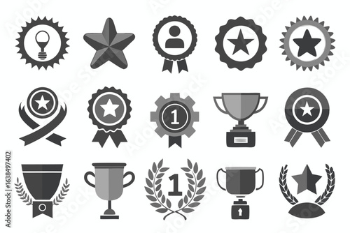award, icon, achievement, recognition, shield, laurel wreath, trophy, medal, winner, first place, success, celebration, competition, ranking, leadership, best, top, victory, ceremony, badge, emblem, symbol, signs, graphic, illustration, vector, design, element, set, collection, group, assortment, variety, silhouette, black-and-white, isolated