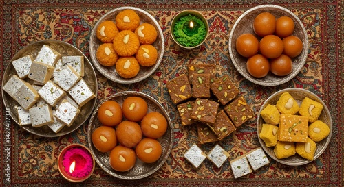 dessert, sweet, food, cookery, arrangement, tableware, presentation, still life, ornate, colourful, texture, pattern, display, delicious, sugar, treat, traditional, culture, celebration, event, indian, eastern, dish, sweet, baked, candied, nut, pistachio, almond, pastry