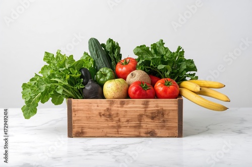 Assortment of fresh produce in a wooden crate on a table with a plain white backdrop. Concept of meal delivery.