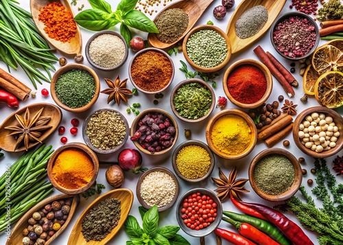 herb, spice, food, culinary, cooking, ingredient, seasoning, favor, aromatic, epicure, aerial photo, white background, arrangement, composition, still life, photo, food photography, assortment, variety, collection