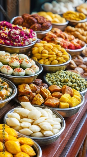 food, indian, sweet, dessert, market, stall, tray, bowl, variety, colourful, delicious, tasty, appetising, sweet, fresh, traditional, culture, cookery, treat, shop, teeth, delicacy, snack, street, culinary, delight, assortment, of