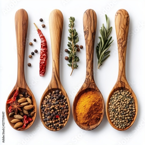 Assortment of Spices: A culinary symphony of flavors and colors in wooden spoons