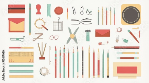 stationery, office, supply, ruler, envelope, paper clip, scissors, eraser, goggles, sharpener, binder, clip, tape, crayons, ruler, envelope, paper clip, rubber, stapler, notepad, red, yellow, green, blue, grey, white, black, flat, design, illustration, graphic, art, collection