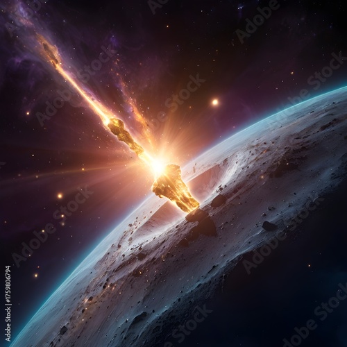 Asteroid Impact on Planet Surface with Fiery Explosion in Space This AI image mimics real-world scenes but contains no actual people, brands, or private property.