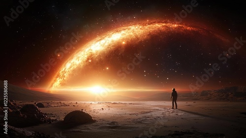 astronaut, planet, sunrise, alien, fiery, desolate, space, cosmos, exploration, universe, galaxy, star, sky, landscape, red, orange, sun, horizon, night, mysterious, adventure, science, fiction, fantasy, cosmic, discovery, wonder, awe, immensity, solitude, journey, travel, future, imagination, hope, dream, power, energy, light, darkness, unknown, human, person