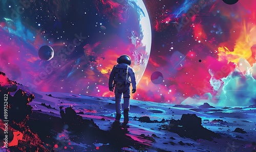 Astronaut walking on a colorful, alien planet with a magnificent galaxy and multiple moons in the sky