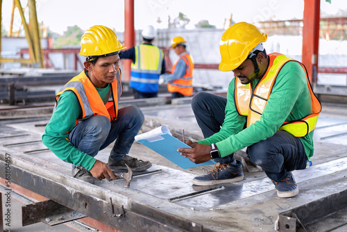 At construction site engineer check drawing correctness concrete mold before pouring concrete