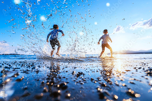 At sunrise, siblings splash in a lake, their joyful energy and vibrant reflections embody sibling love
