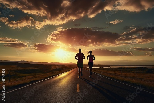 Athletes running on the road in the morning, sunrise training for a marathon, and fitness Runners with healthy lifestyles exercising outdoors.