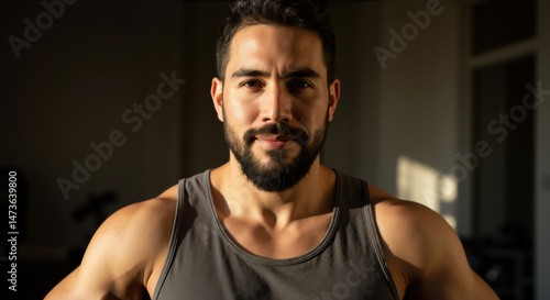 Athletic man with beard in gray tank top with dramatic side lighting and serious expression. Physical strength portrait for fitness motivation and bodybuilding inspiration