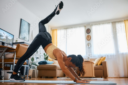Athletic woman doing stretching exercise with leg raise during home workout.