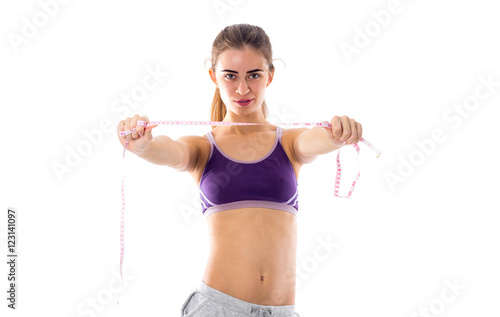 lifestyle, sport, female, background, white, adult, clothing, human, studio, woman, person, well-being, 1, body, young, healthy, standing, people, fitness, muscle, beauty, real, posing, positive, confidence, strength, athlete, health, indoor, muscular, hair, happiness, caucasian, beautiful, grey, natural, purple, top, short, ponytail, holding, centimetre, smiling