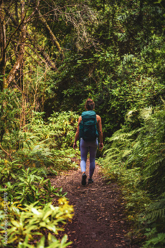Athletic woman walks through adventurous jungle path along green overgrown path. Levada of Caldeirão Verde, Madeira Island, Portugal, Europe.